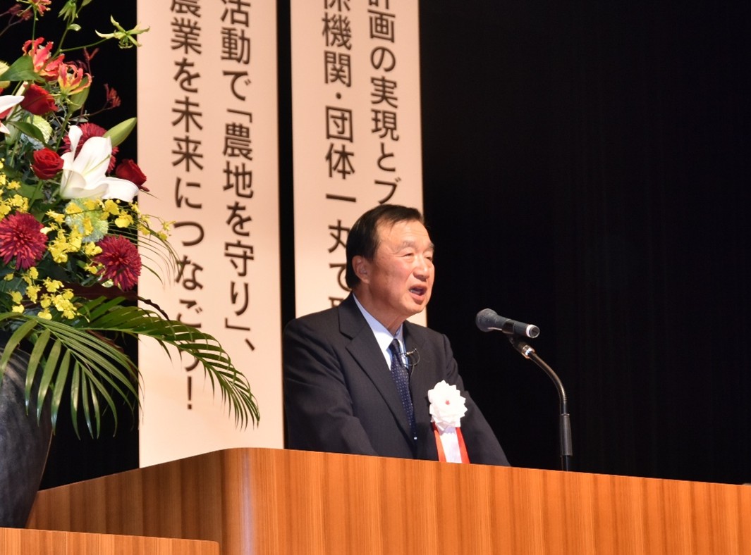 市町村農業委員会等約650名が参加し、農政功労者の表彰、永年勤続農業委員・農地利用最適化推進委員、農業委員会等活動表彰を行なうとともに、「農業施策の充実に関する要請決議」、「農業委員会活動の充実強化に関する申し合わせ決議」を決議、ガンバロー三唱で締めくくりました。